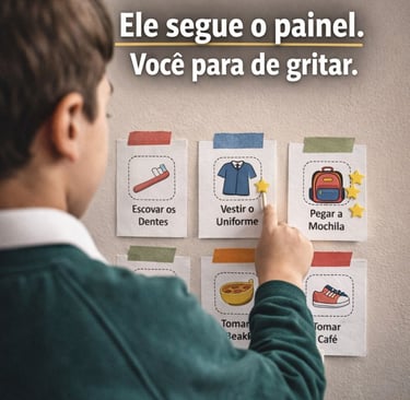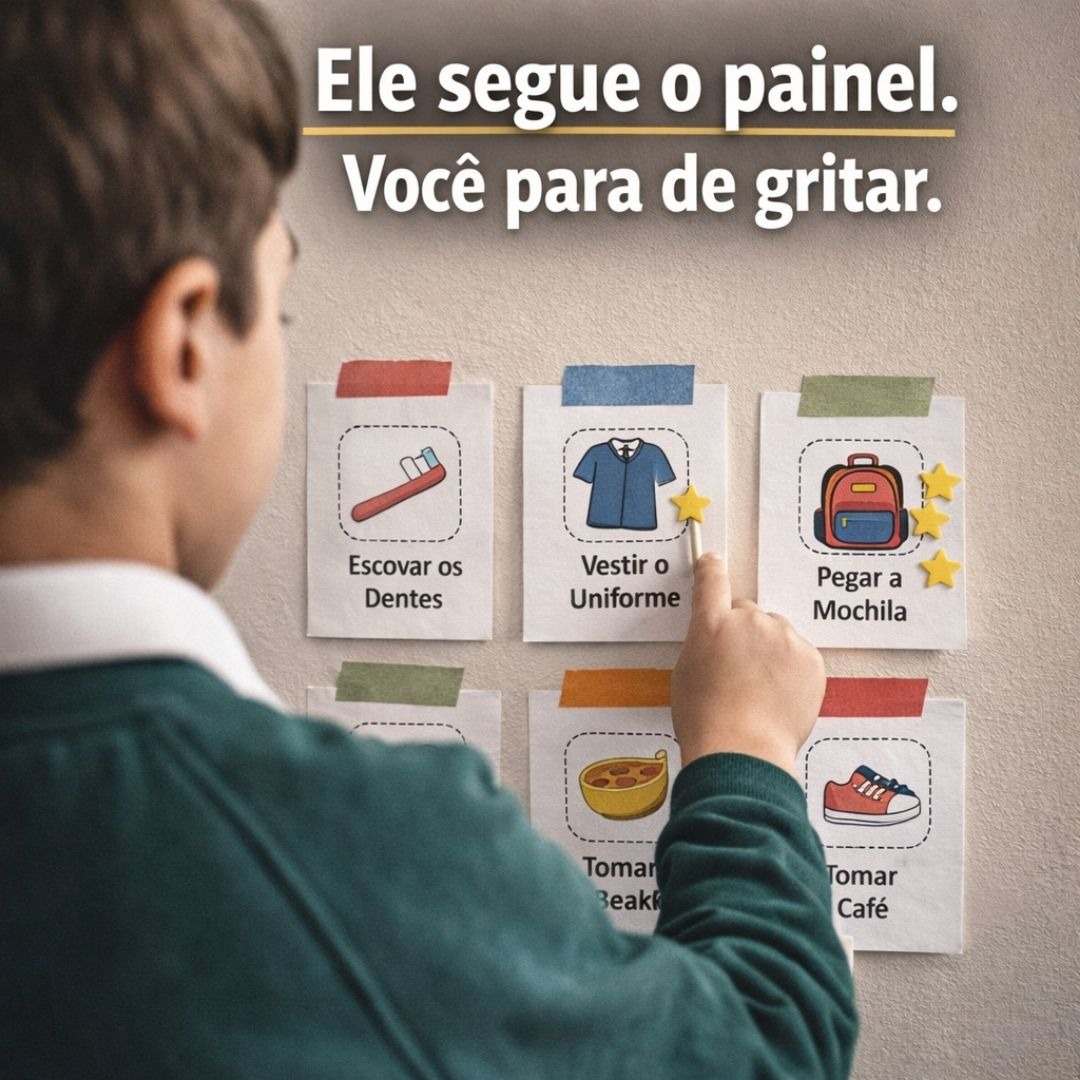 É um guia prático e ilustrado feito para ser o "cérebro auxiliar" do seu filho. Em vez de você dar a ordem, o painel visual mostra o caminho. Sua única função será perguntar: "O que o painel diz agora?".