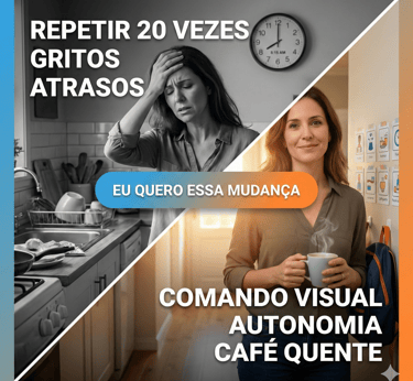 Um método visual e prático para você parar de repetir as mesmas ordens 10 vezes e transformar o caos da manhã em autonomia. Imprima hoje, use amanhã.